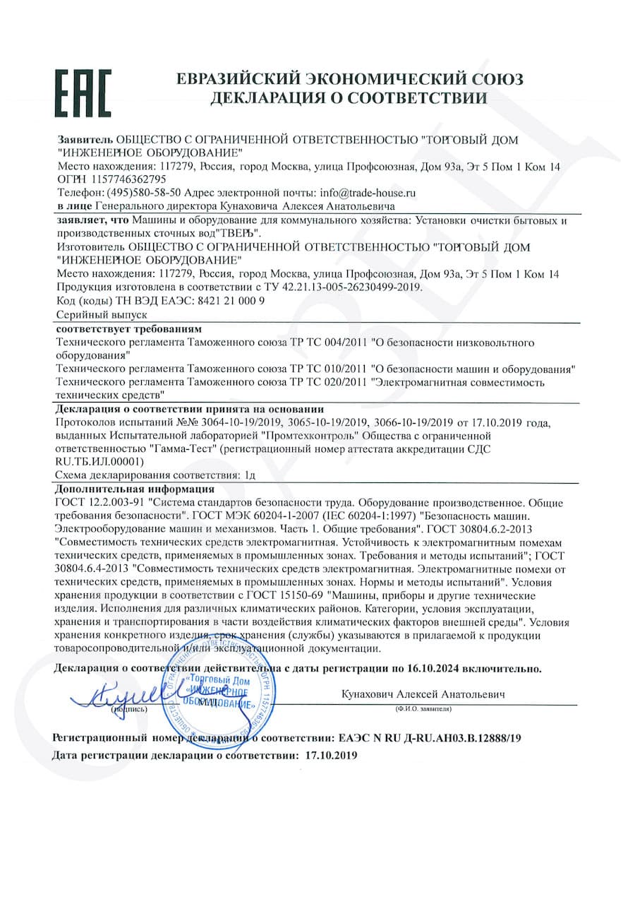 "ТВЕРЬ" - высокоэффективная и надёжная установка очистки бытовых сточных вод. Оборудование предназначено для глубокой механической и биологической очистки, доступен широкий модельный ряд, система подбирается по требованиям заказчика.
